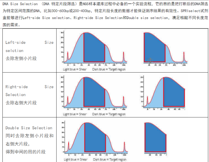 Agencourt SPRIselect是用于NGS(Next Generation Sequencing)核酸特定片段范圍篩選的試劑盒,例如從打斷的gDNA中篩選大小在300-600bp的片段。不僅免去了割膠純化帶來的不便,還可結(jié)合自動化工作站實現(xiàn)高通量樣本制備。