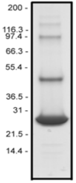 Figure 1: Rap1b His-tagged protein purity determination. A 10 μg sample of RR02 (molecular weight approx. 26 kDa) was separated by electrophoresis in a 12% SDS-PAGE system. The protein was stained with Coomassie Blue.