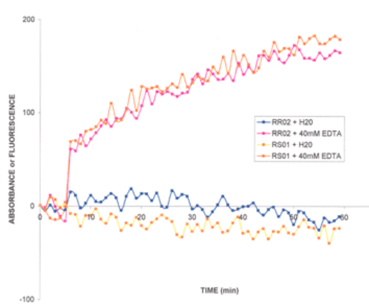 Figure 2: Rap1b GTP exchange assay using BK100. Rap1b protein (1 μM) was mixed with exchange buffer and aliquoted to four wells of a 96-well half area plate. After 5 cycles of reading in a fluorimeter, EDTA was added to 40 mM in the test samples and Milli-Q water to the control samples. Reactions were monitored for 30 min.