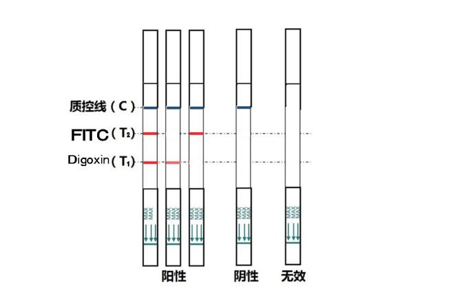 試紙條出現(xiàn)一條藍色條帶,位于質控線(C線);2條紅色條帶,位于檢測線(T線)。陽性結果表明樣本中含有待檢測的核酸片段,且其數(shù)量≥試紙條的最低檢出量。當目的核酸產(chǎn)物濃度較低時,試紙條C線顯色呈藍色,T線呈淡紅色,甚至淺粉色條帶,該結果也應判定為陽性。當目的核酸產(chǎn)物濃度較高時,試紙條C線顯色呈紅色,T線呈紅色,該結果也應判定為陽性。