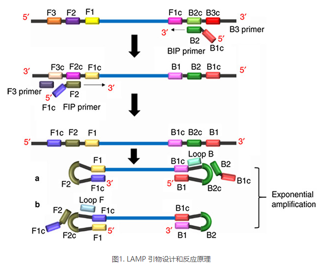 LAMP的反應(yīng)混合物由dNTPs,鏈置換聚合酶,熒光染料,引物和DNA模板組成。用于LAMP反應(yīng)的引物設(shè)計(jì),其特征在于使用四種不同的引物,這些引物是專門設(shè)計(jì)用于識(shí)別靶DNA的六個(gè)不同區(qū)域的。前內(nèi)引物(FIP)由3' 末端的F2區(qū)和5' 末端的F1c區(qū)組成;正向外引物(F3引物)由F3區(qū)組成,其與模板序列的F3c區(qū)互補(bǔ);向后內(nèi)部引物(BIP)由3' 末端的B2區(qū)域和5' 末端的B1c區(qū)域組成。向后外引物(B3引物)由B3區(qū)組成,其與模板序列的B3c區(qū)互補(bǔ)。當(dāng)FIP的F2區(qū)與靶DNA的F2c區(qū)雜交并啟動(dòng)互補(bǔ)鏈合成時(shí),擴(kuò)增開始,然后F3引物與靶DNA的F3c區(qū)域雜交并延伸,取代FIP連接的互補(bǔ)鏈。該置換鏈在5' 末端形成環(huán),這種在5' 末端具有環(huán)的單鏈DNA然后用作BIP的模板,B2與模板DNA的B2c區(qū)域雜交,啟動(dòng)DNA合成,導(dǎo)致形成互補(bǔ)鏈并打開5' -末端環(huán),隨后,B3與靶DNA的B3c區(qū)域雜交并延伸,置換BIP連接的互補(bǔ)鏈,這導(dǎo)致形成啞鈴形DNA。通過Bst DNA聚合酶將核苷酸添加到F1的3' 末端,其在5' 末端延伸并打開環(huán),啞鈴形DNA現(xiàn)在轉(zhuǎn)變?yōu)榍o環(huán)結(jié)構(gòu)(參見a和b)。該結(jié)構(gòu)用作LAMP循環(huán)的引發(fā)劑,其是LAMP反應(yīng)的第二階段。也可以添加環(huán)引物用于LAMP的指數(shù)擴(kuò)增,獲得的最終產(chǎn)品是具有不同莖長度的莖環(huán)DNA和具有多個(gè)環(huán)的各種類似于菜花的結(jié)構(gòu)的混合物。