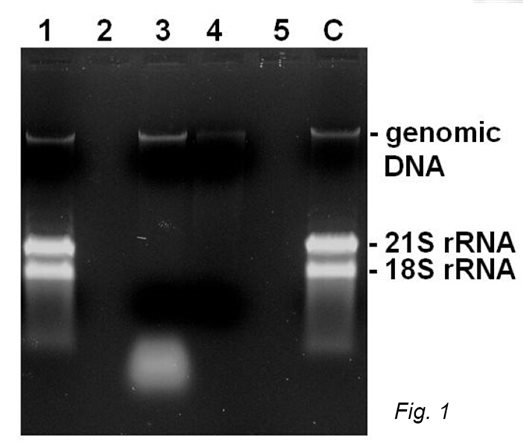 將干燥的RNase A放入反應(yīng)管的樣品1、3和4。然后,RNase A 樣品用1ml的 H2O(3,4) 或RNase-ExitusPlus? (1)處理,室溫下放置5分鐘。緊接著用1ml的無菌水清洗兩次。然后在每個管子里放入從大腸桿菌得到的RNA 5ug。將10ug的新鮮分裝RNase A添加到管4中,所有管在37° c孵育30分鐘。5ug未處理的從大腸桿菌得到的RNA作為對照(C)。最后,加入緩沖液和將樣本加入 1%瓊脂糖凝膠電泳檢測。