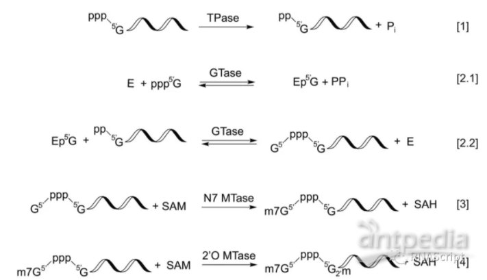 此外,m7G 特異性 2’O-甲基轉(zhuǎn)移酶(mRNA Cap 2′-O-Methyltransferase)還可將核糖2’O位置的核糖核苷酸甲基化生成Cap1結(jié)構(gòu)(反應(yīng) 4)。最近的研究表明,Cap1不僅與翻譯起始有關(guān),在針對外源RNA的先天免疫系統(tǒng)中,還可作為自身RNA的標(biāo)志。