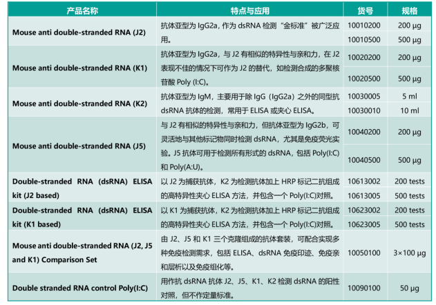 SCICONS是一家向全球研究者提供檢測(cè)雙鏈RNA(dsRNA)小鼠單克隆抗體的公司,其在1990年就開(kāi)始利用雜交瘤細(xì)胞系生產(chǎn)抗雙鏈RNA(anti-dsRNA)的單克隆抗體,熱銷的單抗克隆包括J2、K1、K2和J5,這些抗體識(shí)別dsRNA的特異性非常強(qiáng),與DNA或單鏈RNA ( ssRNA )沒(méi)有交叉反應(yīng),抗體識(shí)別具有序列非依賴性,靶向天然存在的長(zhǎng)度大于40個(gè)堿基對(duì)的雙鏈RNA( dsRNA )以及合成的RNA poly ( I :C) 和poly ( A : U )。