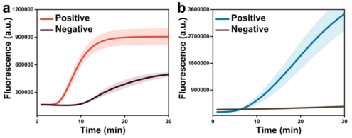 研究人員選取了猴痘病毒的B6R和F3L基因作為檢測(cè)的靶標(biāo),并針對(duì)這兩個(gè)基因篩選了多對(duì)RPA引物。盡管如此,在對(duì)模擬樣本進(jìn)行獨(dú)立RPA擴(kuò)增測(cè)試的過程中仍出現(xiàn)了較多的非特異性擴(kuò)增,這與RPA方法的擴(kuò)增原理相關(guān)。為了解決檢測(cè)過程中非特異性擴(kuò)增的問題,研究人員嘗試將CRISPR-Cas12a核酸檢測(cè)技術(shù)與RPA方法相結(jié)合,并分析相同的樣品。結(jié)果證明該方法使檢測(cè)的特異性得到了明顯的提升,CRISPR-Cas12a識(shí)別了RPA擴(kuò)增子的特定序列,并將其與非特異性擴(kuò)增的產(chǎn)物區(qū)分開來(圖2)。