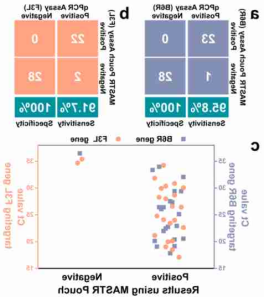 研究人員還使用MASTR袋測(cè)試了各種類型的模擬臨床標(biāo)本,結(jié)果表明MASTR袋擁有與qPCR實(shí)驗(yàn)室測(cè)試相當(dāng)?shù)奶禺愋耘c靈敏度,證明了MASTR袋檢測(cè)猴痘病毒的準(zhǔn)確性(圖4)。