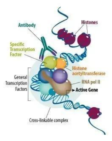 在活細胞狀態(tài)下,當用甲醛處理時,相互靠近的蛋白與蛋白、蛋白與核酸(DNA或RNA)之間會產(chǎn)生共價鍵。細胞內(nèi),當TF與Promoter相互結(jié)合時,它們必然靠的比較近或者契合在一起,這個時候用甲醛處理,能使它們之間產(chǎn)生共價鍵。固定的蛋白質(zhì)-DNA復合物通過超聲或酶處理將其隨機切斷為一定長度范圍內(nèi)的染色質(zhì)小片段,然后通過抗原抗體的特異性識別反應沉淀此復合體,特異性地富集目的蛋白結(jié)合的DNA片段,通過對目的片斷的純化與檢測,從而獲得蛋白質(zhì)與DNA相互作用的信息。通過qPCR或二代測序,篩選與目的蛋白互作的未知DNA信息。