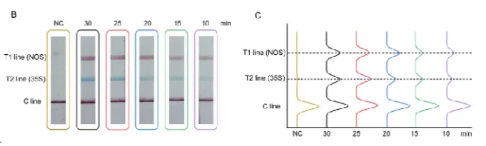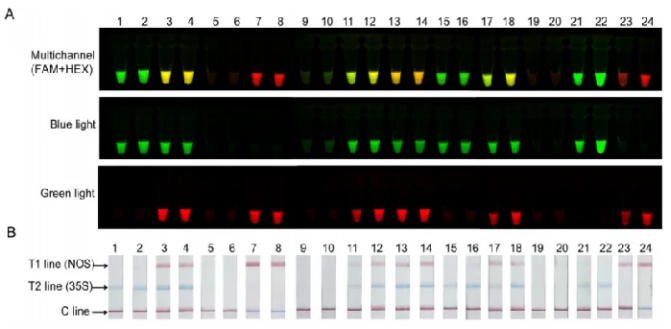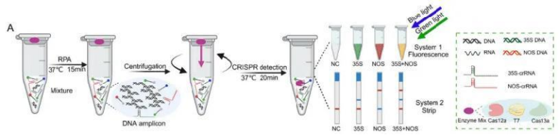 在本研究中,課題組開發(fā)了一種新的一鍋法反應(yīng)——雙重MIRA檢測(cè)結(jié)合雙重CRISPR(MR-DCA方法),用于同時(shí)檢測(cè)轉(zhuǎn)基因作物中的CaMV35S和NOS遺傳靶點(diǎn),為轉(zhuǎn)基因作物的檢測(cè)提供了一種簡(jiǎn)單高效的方法。