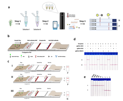 同時,研究人員還發(fā)明了一種適合于植物葉片核酸固相提取新方法,將DNA/RNA固定在葉片組織上,在5~10分鐘內可以完成96個水稻葉片樣本的核酸固相提取。研究人員將Cas-PfLAMP技術、固相核酸提取方法、側向流動試紙條(LFS)優(yōu)化組合,搭建了一套田間快速可視化檢測平臺,并成功用于田間3種水稻病原體(XOO,RSV,RBSDV)的現場檢測。從樣本采集,核酸提取,到最后結果讀出,全程檢測時長約為60分鐘。田間樣本測試結果與常規(guī)的PCR檢測結果完全吻合,證明了Cas-PfLAMP在田間快速檢測時具有準確性高、特異性好。研究結果表明,Cas-PfLAMP檢測系統(tǒng)性能優(yōu)良,不僅適用于水稻病原體的現場快速檢測,還可以進一步擴展應用于其他植物病原體、動物疫病等核酸檢測領域。該研究也為核酸分子快速、可視化檢測提供了新的思路。