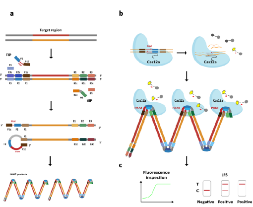 近年來,基于成簇的規(guī)則間隔短回文重復序列(Clustered Regularly Interspaced Short Palindromic Repeats,CRISPR/Cas)系統(tǒng)被廣泛應用于基因組編輯和核酸檢測領域。CRISPR/Cas12a (Cpf1)等具有反式切割活性(trans-activity)以及向導RNA (sgRNA)的雙鏈DNA的特異性識別和切割活性的特點,為新一代快速核酸檢測技術開發(fā)打開了一扇門。如:張鋒教授團隊的夏洛克檢測系統(tǒng)SHERLOCK(Cas13),Doudna教授團隊的DETECTR系統(tǒng)(Cas12 or Cas14),王金/趙國屏教授團隊開發(fā)的HOLMES系統(tǒng)(Cas12)等。該研究,作者開發(fā)了一種不依賴于間隔區(qū)相鄰基序(PAM)、CRISPR/FnCas12a剪切輔助的環(huán)介導等溫擴增(loop-mediated isothermal amplification, LAMP)檢測技術,Cas-PfLAMP。Cas-PfLAMP巧妙的結合了LAMP等溫擴增、FnCas12a蛋白的反式切割活性的優(yōu)點,有效提高了Cas-PfLAMP檢測的靈敏度和特異性,克服了傳統(tǒng)的LAMP檢測假陽性高的缺點。該研究以三種水稻病原體(XOO,RSV,RBSDV)為對象,設計了病原菌特異性的引物和sgRNA,系統(tǒng)評價了Cas-PfLAMP技術的特異性、靈敏度和準確性,結果表明Cas-PfLAMP能夠準確區(qū)分三種水稻病原菌,靈敏度達到了3-9個拷貝/反應。