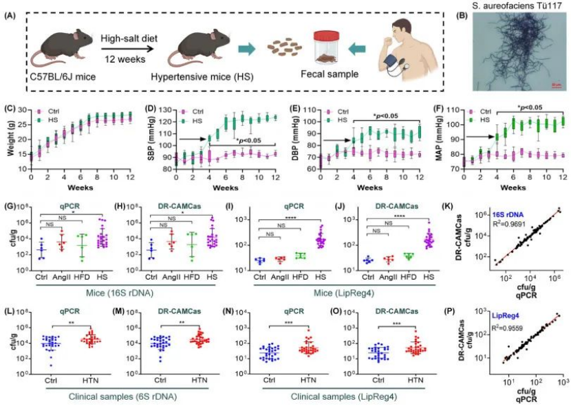 (A)高血壓患者和高鹽飲食誘導(dǎo)的高血壓模型小鼠的糞便樣本。(B)金色鏈霉菌 Tü117 的革蘭氏染色。比例尺:20μm。高鹽飲食小鼠對體重(C)、收縮壓(D)、舒張壓(E)和平均動脈壓(F)的影響(n = 12)。(G - J)使用 DR-CAMCas 和 qPCR 檢測高血壓小鼠糞便樣本中的 16S rDNA 和 LipReg4 基因(對照組:6 只;血管緊張素 II 組:6 只;高脂飲食組:6 只;高鹽組:24 只)。(L - O)使用 DR-CAMCas 和 qPCR 檢測臨床樣本(正常人:30 人;高血壓患者:30 人)糞便樣本中的 16S rDNA 和 LipReg4 基因。(K,P)評估 DR-CAMCas 和 qPCR 在臨床樣本檢測中的一致性。*p < 0.05 與對照組相比,**p < 0.01 與對照組相比,****p < 0.0001 與對照組相比。