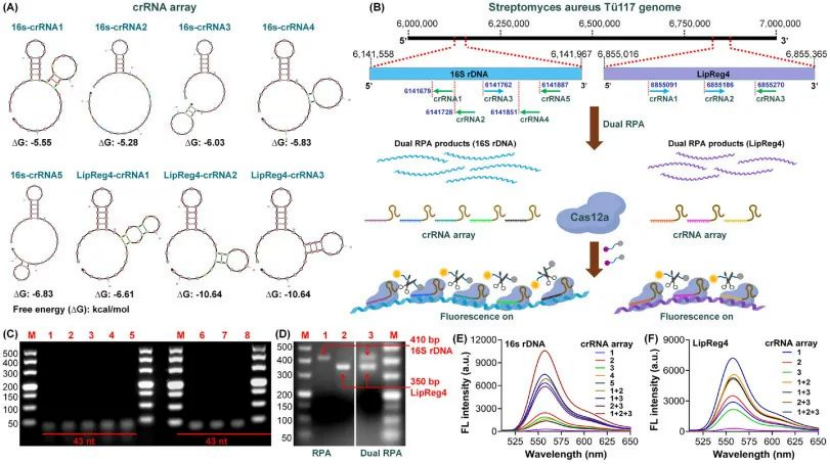 (A)crRNA 陣列的結(jié)構(gòu)、自由能和瓊脂糖凝膠。(B)crRNA 陣列的識別位點(diǎn)、雙重 RPA 過程以及 crRNA 陣列介導(dǎo)的 CRISPR/Cas12a 檢測信號的疊加效應(yīng)。(C)crRNA 陣列的瓊脂糖凝膠。(D)雙重 RPA 和單獨(dú) RPA 產(chǎn)物的瓊脂糖凝膠。(E、F)使用不同 crRNA 檢測 16S rDNA 和 LipReg4 基因的熒光光譜(金色鏈霉菌 Tü117:107 cfu/mL)。
