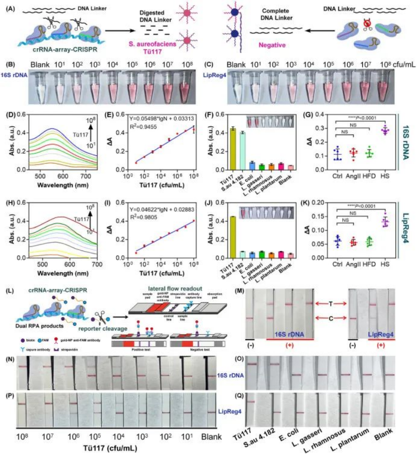 金黃色鏈霉菌 Tü117 的比色法和即時檢測。(A)金黃色鏈霉菌 Tü117 的肉眼檢測過程。照片(B、C)金黃色鏈霉菌 Tü117 濃度增加時 16S rDNA 和 LipReg4 基因肉眼檢測的紫外-可見吸收光譜(D、H)及相應(yīng)的線性擬合曲線(E、I)。(F、J)比色 DR-CAMCas 方法對金黃色鏈霉菌 Tü117 檢測的選擇性。(G、K)比色 DR-CAMCas 檢測法在高血壓小鼠糞便樣本檢測中的實(shí)際應(yīng)用。(L)DR-CAMCas 在側(cè)流生物傳感器(LFB)中的整合?;?DR-CAMCas 的 LFB 檢測法對金黃色鏈霉菌 Tü117 的 16S rDNA 和 LipReg4 基因檢測的可行性(M)、檢測性能(N、P)和選擇性分析(O、Q)