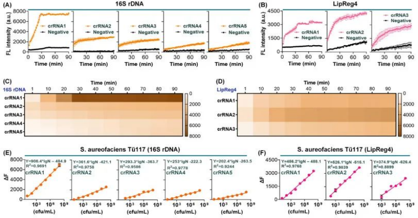 單鏈向?qū)?RNA(single crRNA)介導(dǎo)的 CRISPR/Cas12a 與雙重重組酶聚合酶擴(kuò)增(dual RPA)耦合對 16S rDNA 和 LipReg4 基因的熒光響應(yīng)(A、B)以及隨時間變化在不同單鏈向?qū)?RNA 存在下的熱圖。(E、F)使用單鏈向?qū)?RNA 介導(dǎo)的 CRISPR/Cas12a 與雙重 RPA 耦合檢測 16S rDNA 和 LipReg4 基因的檢測性能。