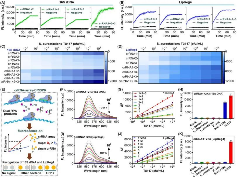 DR-CAMCas 方法對金色鏈霉菌 Tü117 檢測的檢測性能。(A、B)DR-CAMCas 檢測對 16S rDNA 和 LipReg4 基因的熒光響應(yīng)隨時間變化。(C、D)在不同 crRNA 存在下,由 16S rDNA 和 LipReg4 基因誘導(dǎo)的 DR-CAMCas 終點(diǎn)熒光熱圖。(E)使用 DR-CAMCas 對金色鏈霉菌 Tü117 的識別過程。DR-CAMCas(crRNA1 + 2 + 3)對金色鏈霉菌 Tü117 的 16S rDNA 和 LipReg4 基因的熒光響應(yīng)(H、K)和選擇性(H、K)。(G、J)使用不同 crRNA 組合的 DR-CAMCas 對 16S rDNA 和 LipReg4 基因的檢測性能。